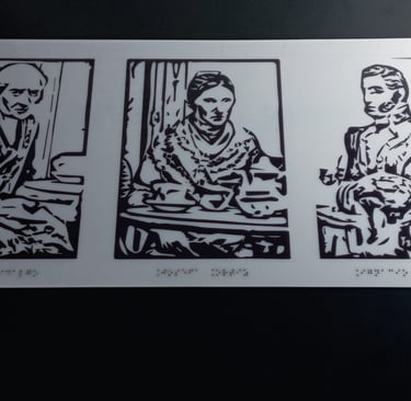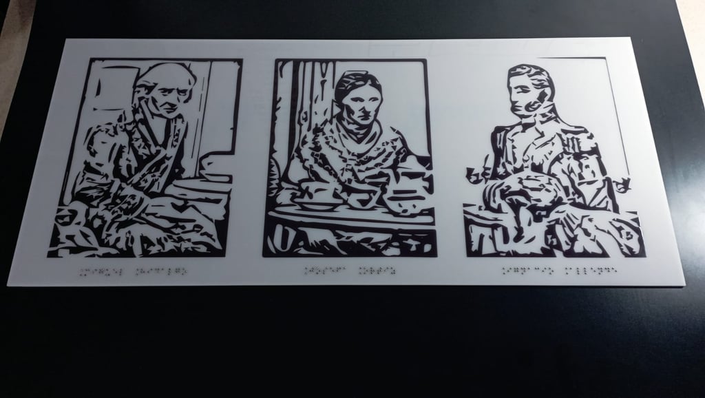 Señalización con braille en Acrílico blanco 3mm corte laser, con impresión realzado y con braille esferas incrustadas acrílicas o metálicas. Para interiores.